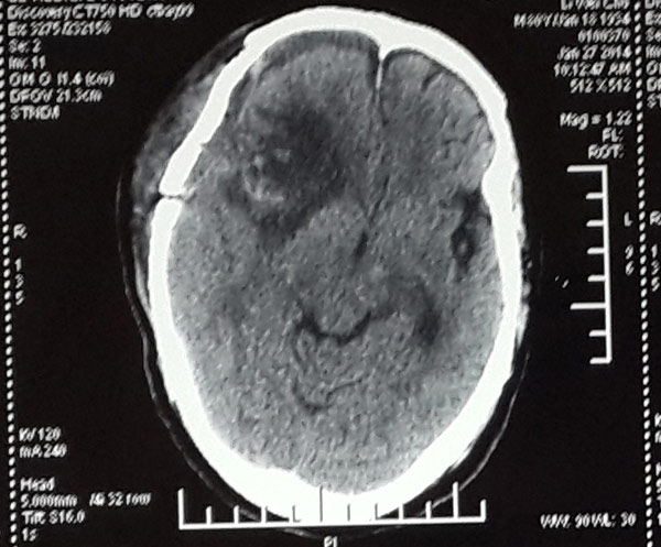 头颅CT显示,李大爷颅内肿瘤已经长至鸭蛋大小,立即手术是挽救老人生命的唯一办法。