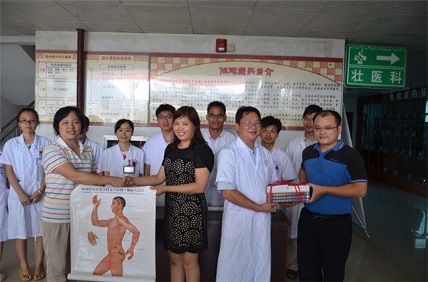 26日下午,外联拓展部林强副主任带领纪云西博士后和推拿科的甘炜医师赶到罗城仫佬族自治县中医院,进行基层重点专科帮扶对接。纪云西博士后在当晚为该院100余名医务工作者进行了主题为《科研项目的选题和申报》的专题报告。27日上午,纪云西博士后和甘炜医师分别对该院的重点专科脾胃病科和针推科进行了重点专科指导查房,对疑难病人进行诊断,并为基层医师对病人的下一步治疗提出具体、可行的建议。工会王粤湘主席和纪云西博士后共同向罗城仫佬族自治县中医院捐赠壮医针灸图本及壮医针灸穴位图。