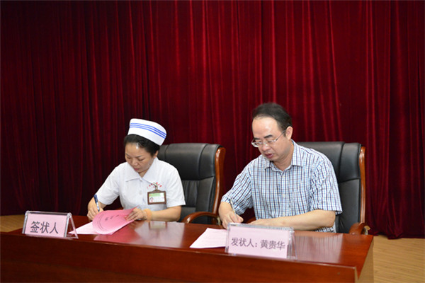 为进一步明确医院各部门在优质护理服务工作中肩负的重任,在启动仪式上,黄贵华院长与部分科室主任签订责任状,一附院办公室主任黄仲海、医务部主任王清坚、后勤部主任李铭、设备科主任傅楚力、药学部主任杨正腾、财务部主任刘小龙、护理部主任韦衡秋、心血管内科一区主任潘朝锌、外六科主任张高炼等九位主任代表逐个上台与黄院长签订优质护理服务评价工作责任状。