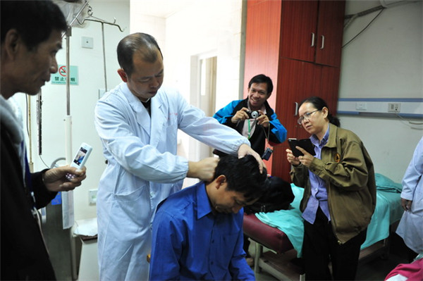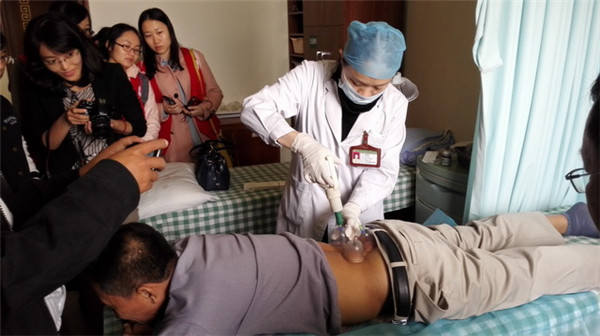 陆璇霖主任为代表团成员演示壮医特色疗法