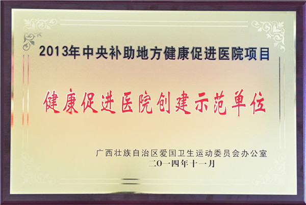 2014年11月18日,广西壮族自治区爱国卫生运动委员会办公室对2013年中央补助地方健康促进医院项目试点单位进行了牌匾颁发,一附院榜上有名,成为广西首批健康促进医院创建示范单位。