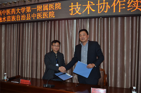在续签协议上,一附院桂雄斌副院长说,一附院和融水县中医医院自2011年4月份结成技术协作医院以来,不仅在人员培训、等级医院建设等方面形成了良好的互动,还进行了壮医科、脑病科等基层重点专科的签约帮扶工作,体现了我们两家医院血浓于水的兄弟情义,希望续签约以后,更加全面地深化医疗、科研、人才培养、中医文化建设等方面的合作,努力实现跨地区医疗资源整合、优势互补、互利共赢。融水县中医院李俊院长介绍了医院的简单情况,对一附院长期以来对融水县中医医院的大力支援表示感谢,希望中医一附院的领导、专家能够常到融水传经送宝,我们也会认真履行合作协议,努力提升自身发展水平,推进两院中医药民族医药事业的科学发展。简单的续签仪式后,一附院心胸血管外科莫安胜博士作题为《普胸外科相关疾病的诊治》、护理部黄沂副主任作题为《领悟中医护理内涵,实施中医特色护理》的专题讲座,为融水县中医医院和香粉乡卫生院150余名医疗护理骨干进行培训。