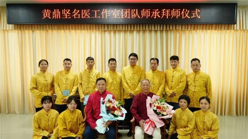 合山市中医医院12名师承人员集体向黄鼎坚教授、何列涛教授行拜师礼,黄鼎坚教授、何列涛教授收下拜师帖,回赠收徒帖,并激励弟子们守正创新,传承经典。