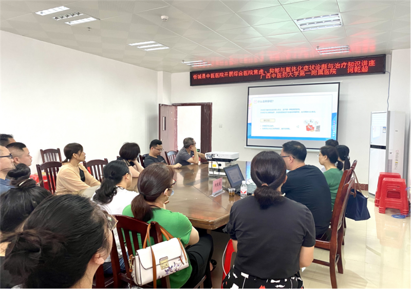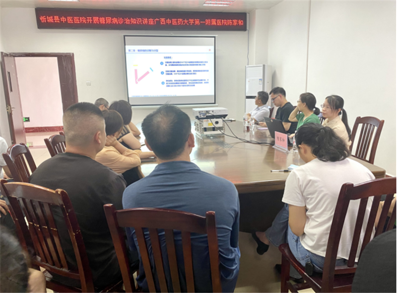 6月14号下午,专家团队奔赴忻城县中医医院新院区(忻城县中医医院城南院区)授课。何乾超主任医师、陈家和主治医师分别为全体医护人员进行《综合医院焦虑、抑郁与躯体化症状诊断与治疗》及《中国2型糖尿病防治指南》解读的专题知识培训。在授课过程将理论联系临床,用通俗易懂的语言,因材施教,大大提高了忻城县中医医院一线医护人员的临床及中医文化知识。