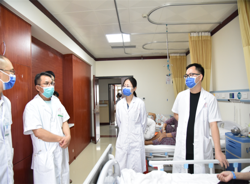 6月15日上午,一附院梁健芬名中医团队及钟江名中医工作室团队兵分两路,对全院内科危重患者进行查房的同时,在大堂进行义诊活动。在查房过程中,结合科室病种特点及昨日培训内容,活学活用,对部分焦虑、抑郁状态的患者及2型糖尿病患者逐一仔细给每一位患者进行问诊、查体的同时,指出一线医生在接诊过程中的注意事项、用药规范,培养医生、护士发现问题、分析问题和解决临床问题能力。在义诊现场,专家们根据自己专业及专长为每一位前来的患者进行咨询和就诊,为他们提供个体化诊疗方案及合理化建议。因忻城县暂无比较权威的皮肤科医院及专家,饱受皮肤病折磨的患者们得知钟江名中医工作室团队的到来早早排起了长龙,每一位患者得到个体化的诊治。义诊结束后,得到施治的患者对专家们讲得最多就是“您们下一次什么再来......?”;“太感谢您们了,解决了我多年的困扰!”。