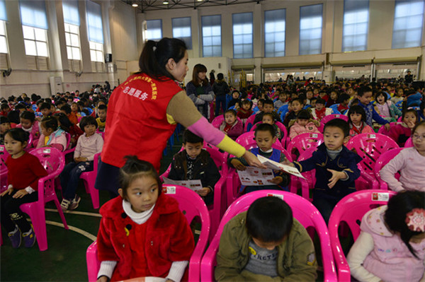 一附院青年志愿者为同学们发放眼保健的宣传资料