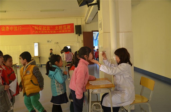 15日当天,首先对桂雅小学的1、2年级同学进行了基本的眼部检查,包括视力检测、散瞳、屈光检查。活动当日得到了学校的大力支持,同学们井然有序的排队、领表、做检查。本次体检共发放500份表格,收回349份表格,对建立南宁市7到12岁青少年屈光状态档案打下了基础。