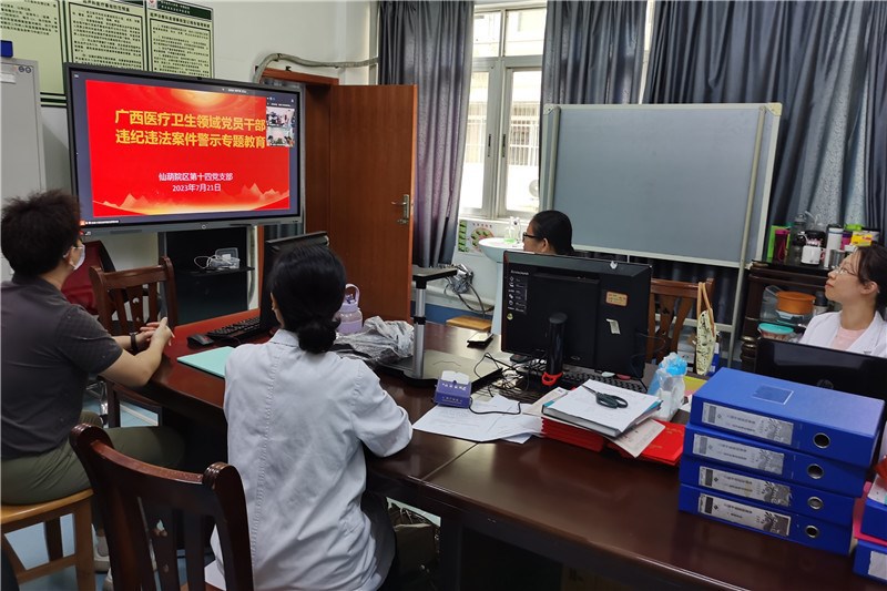 为全面推动廉洁文化建设,践行廉洁行医价值观,弘扬健康向上的医德医风,促使崇廉、守廉和倡廉的廉洁文化深入人心,7月21日中午,一附院仙葫院区党总支第十四党支部开展深入学习广西医疗卫生领域党员干部违纪违法案件警示专题活动。