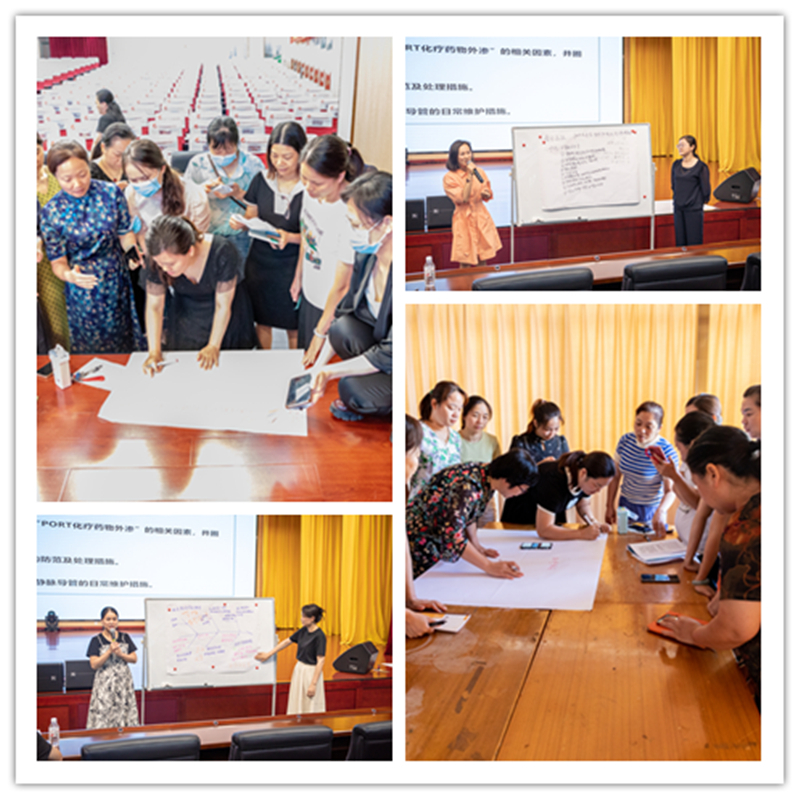 在典型护理不良案例分析环节。来自各护理单元的与会护士长和护理骨干分成六个小组,就一例输液港外渗案例,分别从护理管理者和一线临床护士的角度进行分组讨论。讨论结束后,各小组代表上台发言,根据案例发生的各个环节进行问题梳理,逐层剖析找出事件根本原因,完善相关制度流程,拟定风险防范对策。随后,医院静脉治疗专科护士、乳腺外科杨羚护士长对各组观点进行点评和总结,并针对输液港使用及维护相关知识进行了现场再培训。
