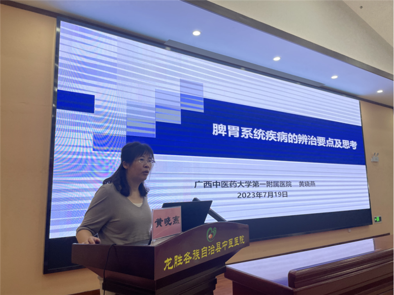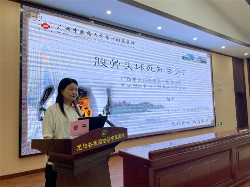 在龙胜县中医医院副院长罗文君的主持下,首先是龙胜县中医医院党委书记彭伟对前来传道、授业的各位名中医团队成员表示热烈的欢迎和感谢,希望通过名医八桂行的活动,能把各个名中医团队的学术思想、特色技术传递到基层中医院,协助培养专科中医人才,促进龙胜县中医院的快速成长。接下来,曾平教授分享了股骨头坏死的诊疗经验,黄晓燕教授总结了中医治疗脾胃系统疾病的要点,梁健芬教授梳理了缺血性脑卒中临床管理方案。讲座内容丰富精彩,全院医护一致好评。