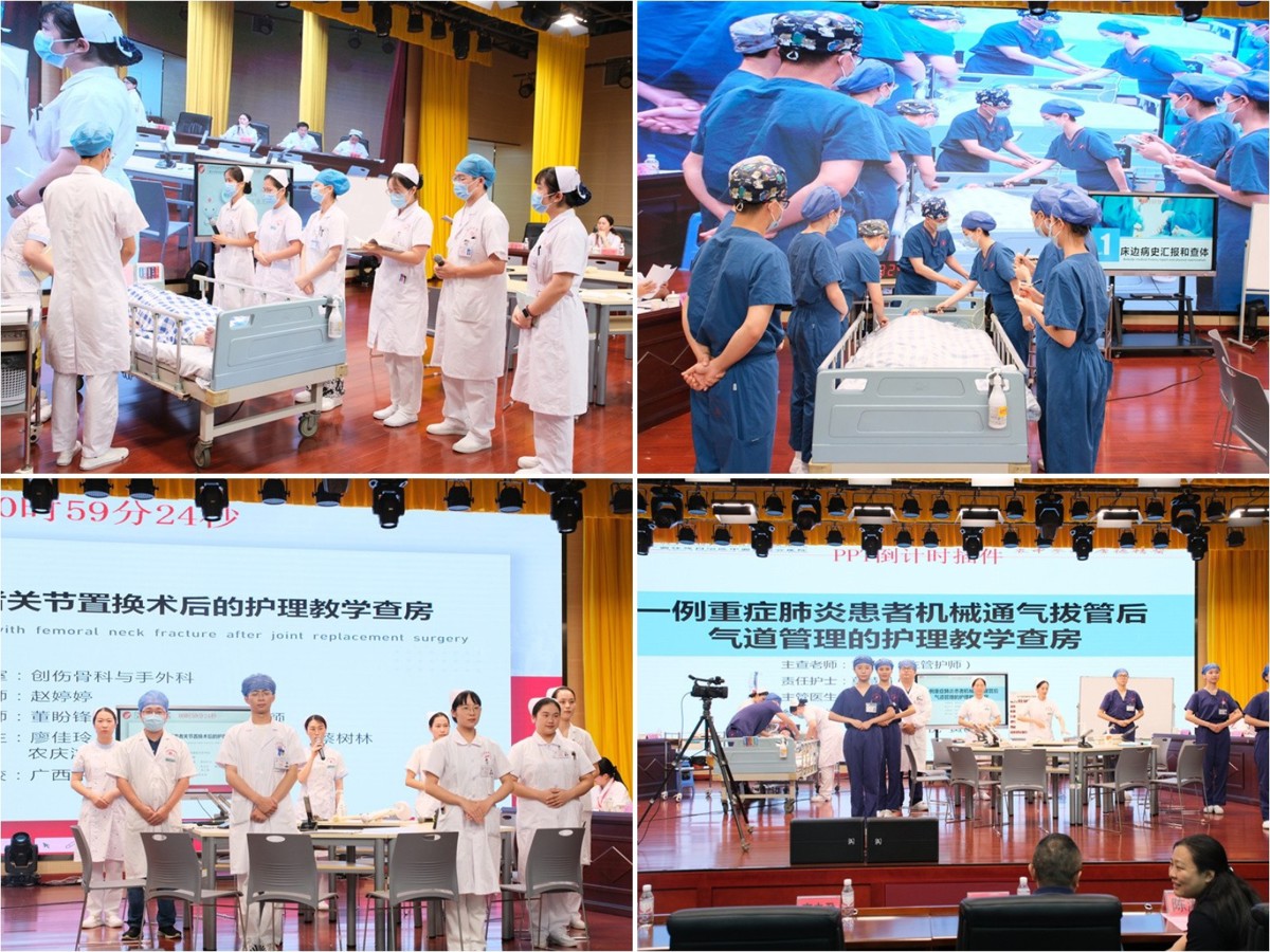 在决赛环节,8支教学团队同台竞技。参赛选手通过视频导入、情景模拟、现场查体、互动提问等方式开展了多形式的临床护理教学查房,细微处体现人文关怀,彰显了护理教学查房的内涵,展示了深厚的教学功底和护理师资队伍的风采。