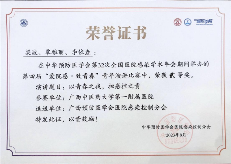 为大力弘扬医院感染管理工作者的奉献精神,传播医院感控文化,激发广大青年医院感染工作者爱岗敬业的工作热情。8月15-17日,中华预防医学会第32次全国医院感染学术年会在江苏省南京市召开,同期举办了“爱院感-致青春"演讲比赛。一附院仙葫急诊科李依垚、覃雅丽、梁波三人的演讲项目《以青春之我,担感控之责》通过区内选拔,以全区第一名的成绩代表广西预防医学会感控分会参加本次比赛,并在57个节目,120余名青年才俊中脱颖而出。