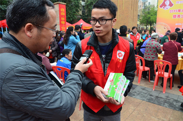 一附院青年学生志愿者黄海东同学在发放中医养生保健手册时,还接受了广西电视台记者的现场采访。黄同学告诉记者,一附院发放的中医养生保健手册,不仅包含了日常中医养生保健的小常识,还有四季养生、中医治未病等方面的内容,图文并茂、简单易懂,希望能够给在场的群众送去知识、送去健康。