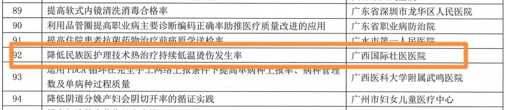 近日,国家卫生健康委医院管理研究所公布医疗质量安全持续改进典型案例活动各奖项名单,广西国际壮医医院骨关节与运动医学科开展的“降低民族医护理技术热治疗持续低温烫伤发生率”项目入围“卓越”案例名单。