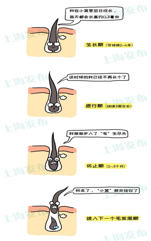 一般来说,成年人有85%~90%的毛发在长个子,有1%~3%则已不再成长,有10%~15%正陆续地离开毛囊。因此这样的更新迭代是非常正常的,但需要注意的是,正常人每日的脱发量一般不会超过100根。
