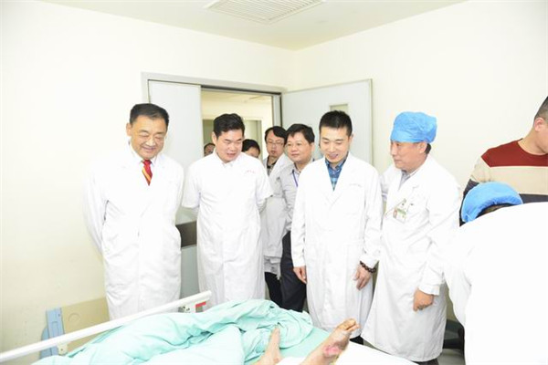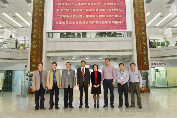 2015年3月16日,中国中西医结合学会常务理事、中国中西医结合学会烧伤专业委员会名誉主任委员、《中国烧伤创疡杂志》总编、“人体再生复原科学”发明创立人、美国“损伤器官再生科学发展国策”专利权人、“全球再生愈合终止糖尿病足截肢计划”临床专家委员会主任委员徐荣祥教授、中国中西医结合学会烧伤专业委员会常委、《中国烧伤创疡杂志》副总编、“全球再生愈合终止糖尿病足截肢计划”临床专家委员会副主任委员、北京美宝烧伤疮疡研究所王洪生研究员、中国中西医结合学会烧伤专业委员会办公室王雁主任一行3人到一附院考察、技术指导并座谈。一附院院长黄贵华、党委书记李敏智、副院长桂雄斌以及院办、医务部等科室负责人热情接待了徐荣祥教授一行,右江民族医学院副校长唐乾利教授陪同参观指导。