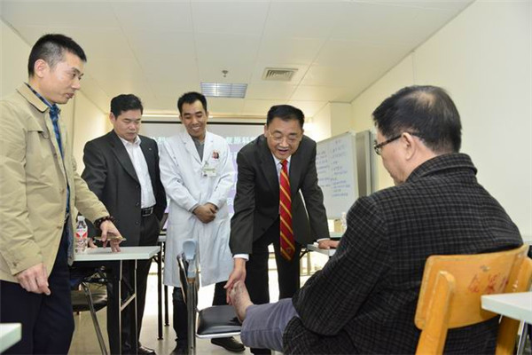 徐荣祥教授一行参观了一附院院 史馆、中医文化长廊,黄贵华院长介绍了广中医的发展历史和医疗、教学、科研、仙葫分院建设等方面的工作,以及医院中医药文化建设情况。随后,徐荣祥教授来 到外五科,就糖尿病足的规范化治疗与外五科医护人员进行了学术交流,并深入病房对糖尿病足患者进行会诊、指导治疗。糖尿病足是糖尿病患者的主要并发症,据 联合国卫生组织公布的数据显示,全球因糖尿病截肢的人数为人类总截肢数的50%,每30秒就有一个糖尿病患者截肢,但即使截肢,5年死亡率仍高达70%,失去部分或全部肢体造成的残疾,极大地影响着患者的生活质量和生命安全。当今世界各国仍没有治愈3~5级糖尿病足的任何有效技术和药物,以徐荣祥教授为主任委员的“全球再生愈合终止糖尿病足截肢计划”临床专家委员会,将与世界各国糖尿病足临床专家一道,掀起并致力于一场终止糖尿病足截肢、解救糖尿病患者肢体和生命的“救众生”行动,并有意将一附院作为MEBO——DFU再生技术(湿润烧伤膏糖尿病足医疗技术)培训基地。