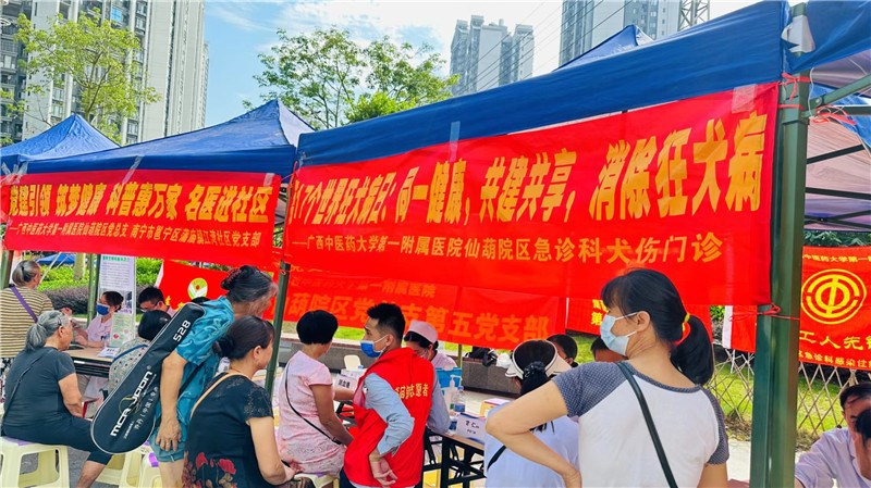 为深化为民服务办实事,落实健康科普“五进”服务行动,响应“服务百姓健康行动”义诊活动号召,同时迎接第17个世界狂犬病日主题科普活动:“同一个健康,共建共享,消除狂犬病”。一附院仙葫院区党总支联合邕宁区蒲庙镇江湾社区党委于在9月27日在江湾社区举行“名医进社区,科普惠万家”义诊活动。