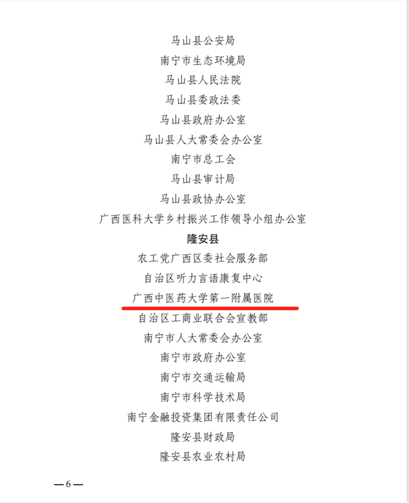 近日,中共南宁市委员会组织部下发了《关于通报表扬 2021-2022 年度全市驻村工作队先进集体和优秀个人的通知》,通报表扬94个先进后盾单位、100名优秀驻村第一书记、200名优秀驻村工作队员。一附院荣获南宁市2021—2022 年度驻村工作队先进后盾单位称号。