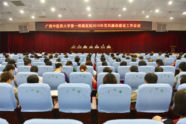 4月16日下午,一附院在住院综合大楼5楼多功能学术厅召开2015年党风廉政建设工作会议并在会上签订责任书。一附院党委书记李敏智,党委副书记、院长黄贵华,党委副书记、纪委书记、副院长吴西西,副院长卢健棋、桂雄斌、谢胜、周建国等院领导,以及全体中层干部、临床科室总住院医师、重点岗位相关工作人员近300余人参加了会议。会议由黄贵华院长主持。