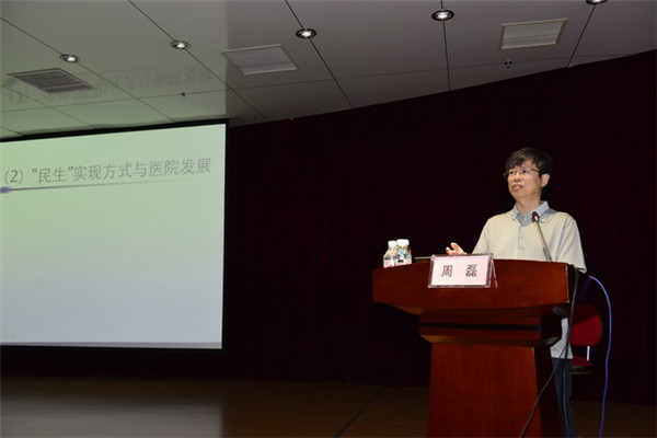 周教授首先从医院发展的要素和现实展开授课,并深入浅出地分析了医院管理学的“三维度”, 点明了医院管理学的灵活性和特殊性。他指出:在医院品牌和文化的建设中,政策是基础、定位是前提、建构是核心、执行是关键;在政策方面,医院的发展首先要认清发展方式发生了哪些转变,管理方式与过去有什么不同,新背景下医院应该选择怎样的发展道路;定位上,医院的发展、品牌、运营、文化、管理都要形成准确的定位,要能够联合区域内的医疗资源和诊疗优势,从社会、患者、员工三个角度出发,打造独特的医院品牌和医院文化,在医院内推动人性化管理制度的建立;品牌和文化的构建,取决于责任和标准,能力、心理和身体的建设,是责任观构建的灵魂,建立具体的、统一的、可操作性强、认可度高的服务标准,是标准化工作的轴心;从加强执行力角度考虑,医院全体员工要上下一心、要理解和认同医院的决定,医院也要营造言行一致的执行工作氛围,要有协调一致的管理模式和灵活的管 理执行模式。