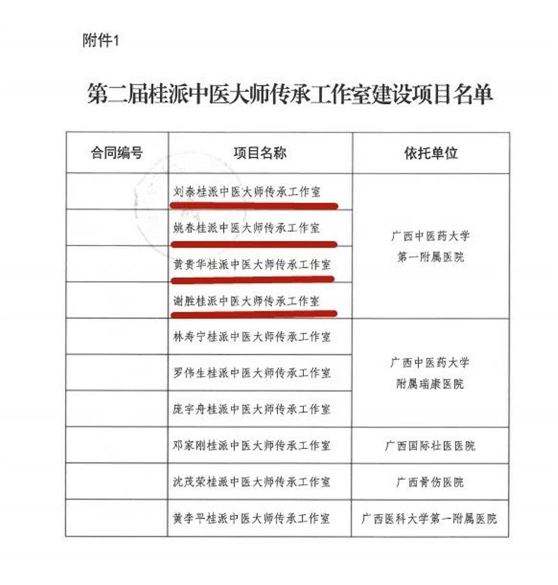 一附院4名第二届桂派中医大师姚春、黄贵华、谢胜、刘泰,6名广西名中医王清坚、韦艾凌、李美康、何育风、张勉、梁健芬获自治区专项资金支持建设传承工作室,建设期3年。