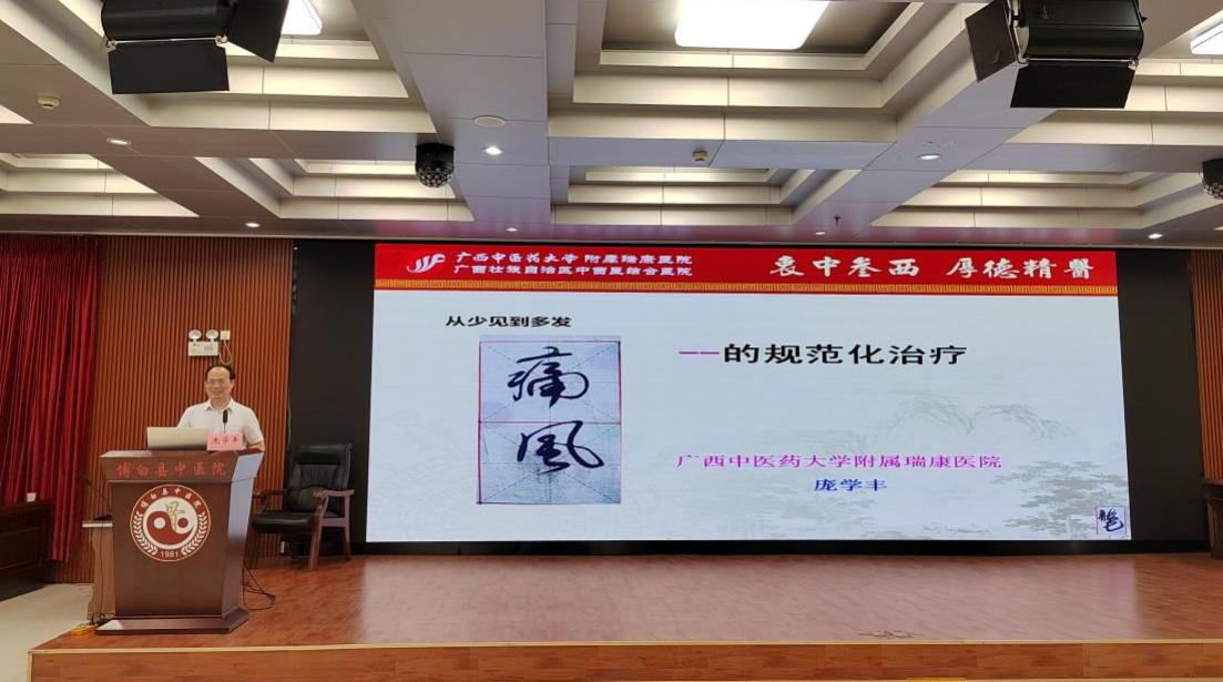6月7日下午,活动启动仪式在博白县中医医院举行,庞学丰教授以《痛风的规范化治疗》为题授课,讲述了痛风的病因病机、诊断要点、西医治疗、中医辩证论治要点、药膳食疗养生方法等几个方面,将中医辩证思维和临床应用进行分享与探讨,在场医护人员纷纷表示受益匪浅。随后,由李玉玲副教授也带了精彩授课。