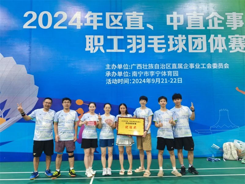 9月21日至22日,由广西壮族自治区直属企事业工会委员会主办的2024年区直、中直企事业职工羽毛球团体赛在南宁李宁体育园举行。第一附属医院羽毛球代表队凭借娴熟扎实的球技在52支参赛队中表现优秀,获得比赛优胜奖。