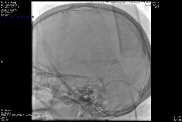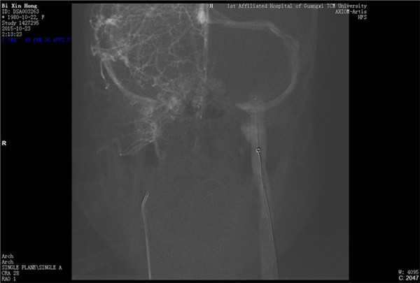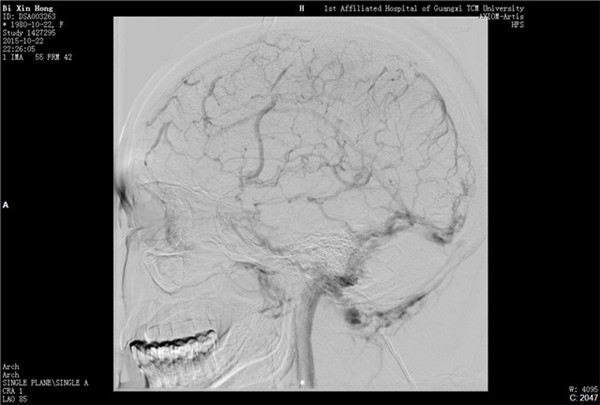 患者闭某,女性,35岁,因产后十余天,进行性头痛就诊收入我科,患者头颅CT证实颅内多发出血灶,静脉窦栓塞可能。患者入院后头痛呈进行性加重,出现反复癫痫,病情危重。我科张高炼主任医师、黄建荣副主任医师查看病人后认为患者属于上矢状窦栓塞,是急性脑卒中的一类,而且已出现梗塞性出血,保守治疗效果极差,既往无血管内治疗的情况下死亡率高达80%以上,即使存活患者也会有严重的神经功能障碍甚至长期昏迷可能,如进病情一步发展,患者势必因颅内高压、梗塞性出血,甚至引起脑疝而导致死亡。
