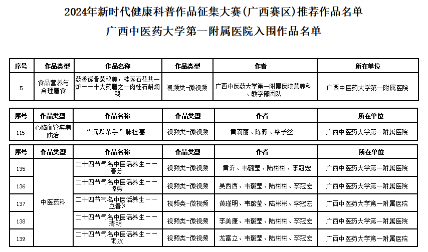 此外,近日一附院有7件作品在“健康知识普及行动——2024年新时代健康科普作品征集大赛”(广西赛区)脱颖而出,被推荐到这项由国家卫生健康委、科技部、国家中医药局、国家疾控局、中国科协主办的大赛组委会参加最终评审。