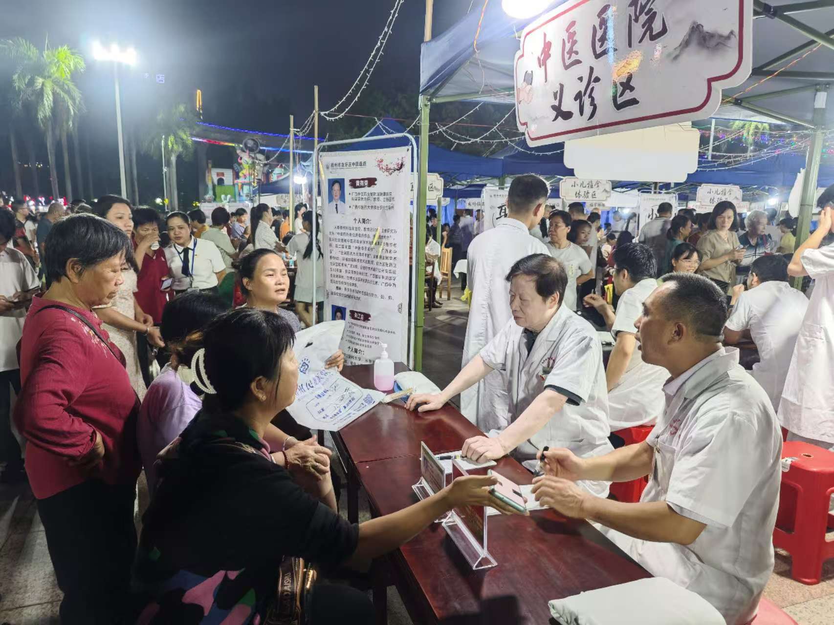 10月19日晚,黄有荣教授及其团队成员朱江龙主任医师、章晓云副主任医师、丰新健副主任医师以及蓝崇主治医师,参加梧州市龙圩区中医文化之夜义诊活动。专家团队为居民群众问诊号脉、体质辨识、辨证开方,并给予个体化的中医治疗和调理指导。活动从19时开始,原本计划21时30分结束,但由于前来就诊人数较多,黄有荣教授不间断地为群众看病至深夜23时多,诊疗服务人数达100余人。