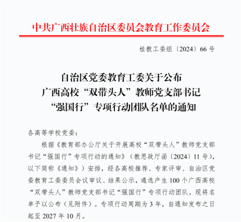 近日,自治区党委教育工委发布《关于公布广西高校“双带头人”教师党支部书记强国行”专项行动团队名单的通知》,第一附属医院仙葫院区第九党支部荣登榜单。这是仙葫院区第九党支部在成为全国公立医院临床科室标杆党支部、首批新时代广西高校党建工作样板支部、广西教工委“五星级党支部”、广西公立医院“五星级党支部”之后获得的又一项重要荣誉。