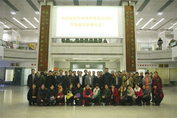 2016年2月24日上午,贺州市中医医院院长吴家恩、党委书记张飚、副院长谢明映、党委副书记曾红儒及医院主要职能、临床、医技科室主任40余人到一附院参观交流,一附院院长黄贵华、副院长桂雄斌、周建国及相关科室主任接待客人并进行座谈。