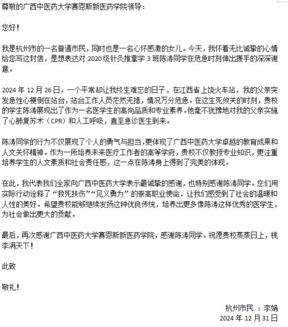 据信中描述,2024年12月26日,在江西省上饶火车站,李娟的父亲突发急性心梗倒地,情况危急。在这一紧急时刻,陈涛同学上前向高铁乘务员及家属表明自己是医学生的身份,在征得同意之后,通过询问病史,结合病人发病特征,运用在校所学的心肺复苏术(CPR)和人工呼吸实施紧急抢救,直至救护车到达现场。陈涛的迅速反应和专业操作为李娟的父亲争取了宝贵的救治时间。李娟还在信中说到:“陈涛同学的行为不仅展现了个人的勇气与担当,更体现了星空彩票老版本下载赛恩斯新医药学院卓越的教育成果和人文关怀精神。”