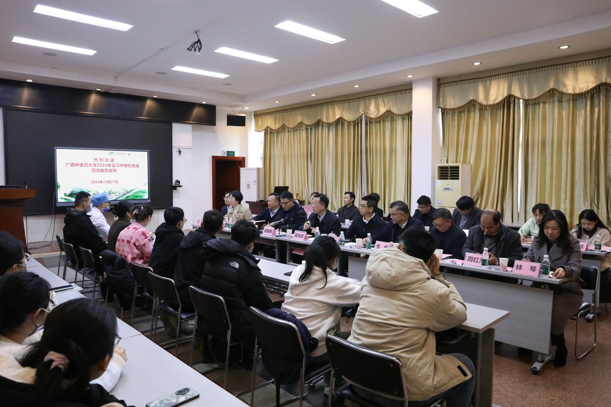 检查组深入科室实习岗位,实地查看学生的工作环境,进行实习中期考核,并与学生座谈交流,了解他们的工作、生活和职业发展情况。