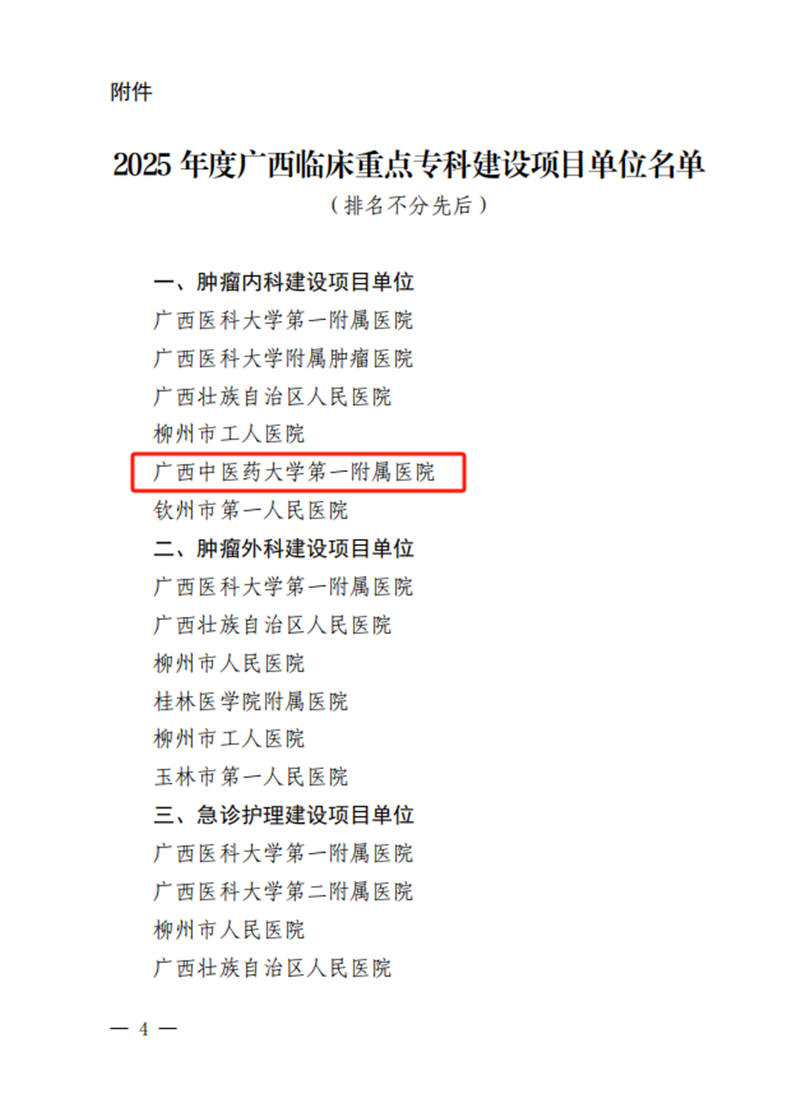 近日,自治区卫生健康委公布了2025年度广西临床重点专科建设项目单位名单,第一附属医院成功获批广西临床重点专科肿瘤内科建设项目单位。这一殊荣不仅标志着第一附属医院肿瘤内科在恶性肿瘤诊疗领域取得的优异成绩获得了肯定,也预示着肿瘤学科未来将在中西医结合肿瘤诊疗方面迈出更加坚实的步伐。