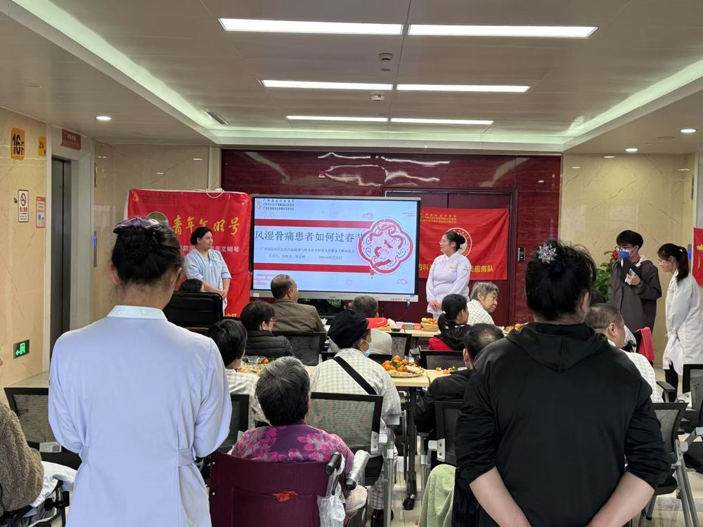 与其说是座谈会,不如说是“茶话会”。简单的会场里,医护人员借助电子屏幕、肢体语言以及平白、朴实的讲授,为风湿骨痛患者科普应以何种合理的生活方式过节,在日常锻炼中要注意什么,科学饮食与规范用药为何如此重要等。台下的患者吃着果、喝着茶、听着课,时不时踊跃举手答问……获得感与舒适感充盈。
