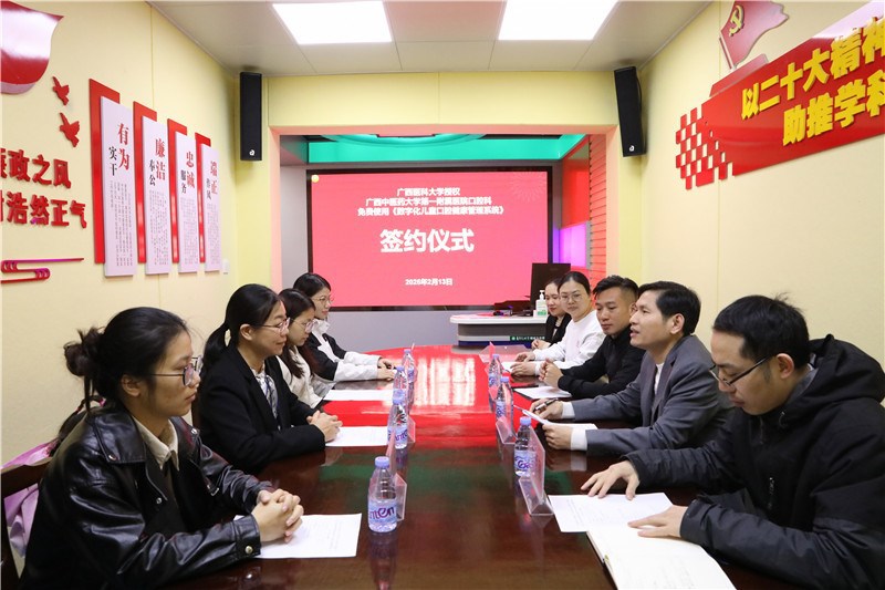 为更好提高儿童口腔健康水平,实现数字化医防协同愿景,2月13日上午,广西医科大学正式授权我校第一附属医院口腔科免费使用“数字化儿童口腔管理系统”,并在第一附属医院举行签约仪式。该系统由广西医科大学附属口腔医院预防科主任邱荣敏博士团队研发。第一附属医院副院长陈广辉出席签约仪式。