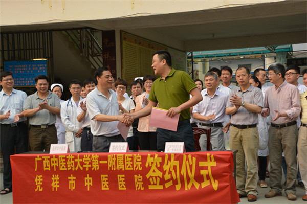 2016年4月14-15日,一附院副院长、仙葫院区院长桂雄斌带领专家团队,到祖国南疆边陲凭祥市开展“三月三”壮瑶医药宣讲和义诊活动。同时,凭祥市中医医院通过签约挂牌成为一附院技术协作医院。