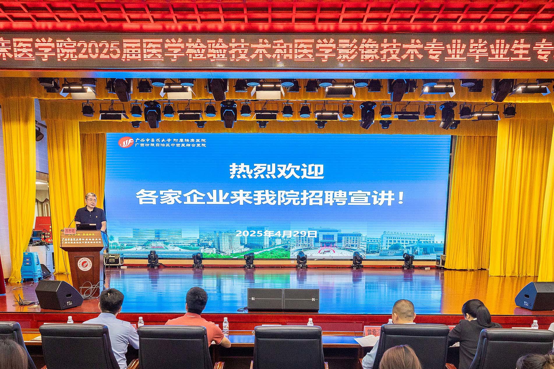 为促进2025届医学检验技术和医学影像技术专业毕业生高质量就业,近日,附属瑞康医院在B座十楼学术报告厅举办了2025届医学检验技术和医学影像技术专业毕业生专场招聘会。学校招就处副处长丁天全,医院党委书记高宏君、党委副书记王德胜、纪委书记彭定基出席会议,检验科、学生科、医学影像科负责人,深圳迈瑞南宁分公司、广西北部湾创新投资有限公司等9家企业代表以及150余名2025届毕业生参加会议。会议由王德胜主持。