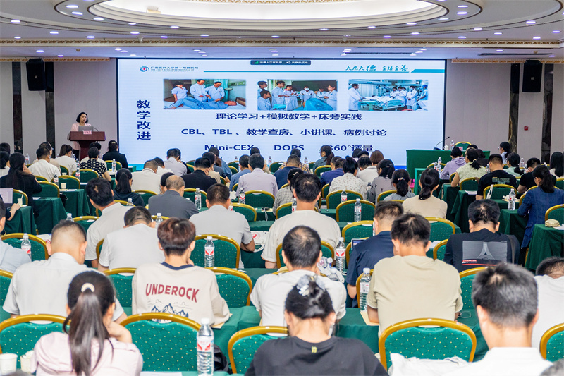 5月17日,由自治区中医药管理局主办、附属瑞康医院承办的2025年中医医师规范化培训结业考核临床实践能力考核考官能力培训班在南宁举办。自治区卫生健康委党组成员,自治区中医药管理局党组书记、局长黎甲文,自治区中医药管理局科技教育处处长杨艳光,自治区卫生健康人才与技术服务中心主任闭闵,附属瑞康医院院长、基地主任唐红珍,副院长古联出席开班仪式。本次培训采取线上、线下相结合的形式进行。来自全区各中医规培基地的230余名考官及考务人员参加现场培训,1000余人次在线上参会参训。