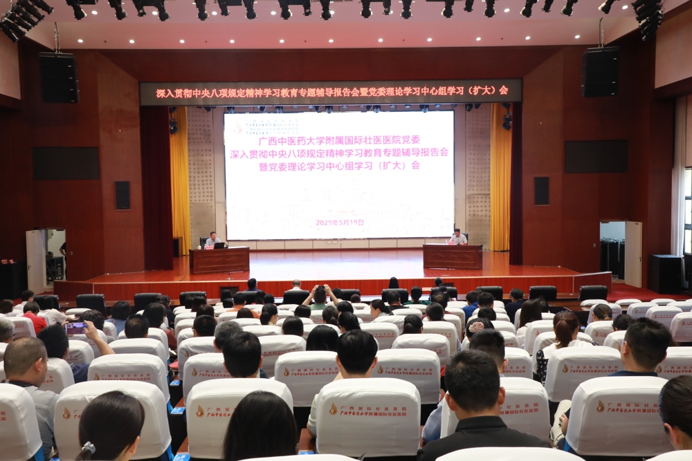5月19日下午,广西国际壮医医院举办深入贯彻中央八项规定精神学习教育专题辅导报告会暨党委理论学习中心组学习(扩大)会,邀请自治区党委党校文史教研部主任张忠友教授做专题辅导报告。医院党委书记秦祖杰主持会议,在家领导班子成员、全体中层干部,各党总支、党支部书记及支部委员参会。