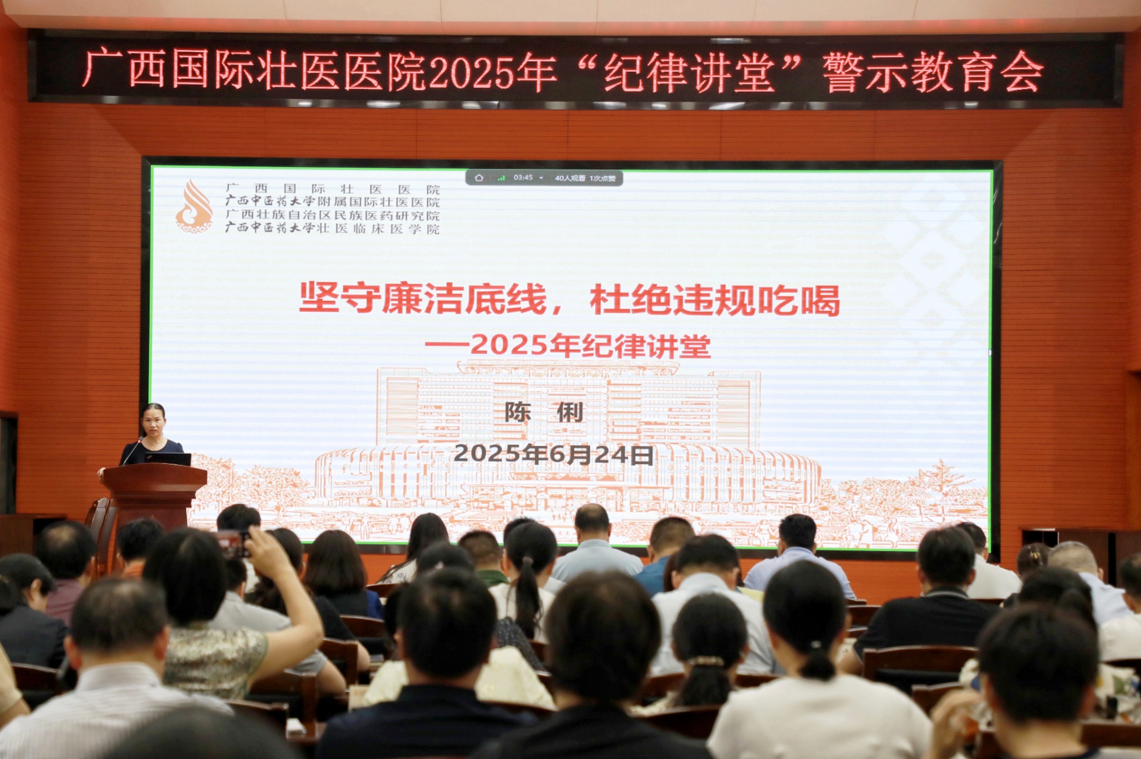 6月24日下午,附属国际壮医医院纪委以“纪律讲堂”的形式召开违规吃喝专题警示教育会,进一步压实责任、传导压力,推动深入贯彻中央八项规定精神学习教育走深走实。医院领导班子、中层干部等80余人参加会议。