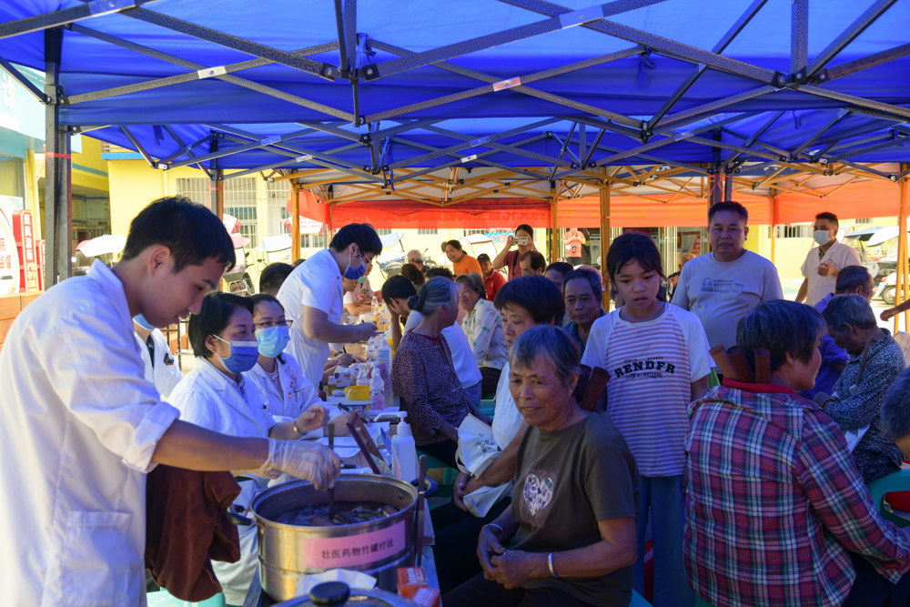 义诊现场,不少群众冒雨排队等候。国壮风湿病科、壮医经典病房、妇科、儿科、疼痛科、骨三科(创伤骨科)、治未病中心、壮医针灸科/推拿科、肿瘤科的专家团队,以及忻城县中医医院的医护人员,耐心为群众把脉问诊、量血压、讲解病情,普及中医治未病养生知识。根据不同疾病特点,为群众提供壮医药线点灸疗法、壮医水蛭疗法、壮医药物竹罐疗法、壮医滚蛋疗法、壮医锤痧疗法等特色技法体验。现场还可品尝美味的中医药膳,让群众切身感受中医药、壮瑶医药的独特魅力。