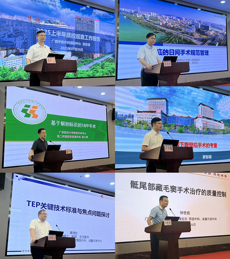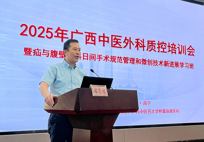 7月26日,广西中医外科质控中心(挂靠附属瑞康医院)在南宁举办“2025年广西中医外科质控培训会暨疝与腹壁外科日间手术规范管理和微创技术新进展学习班”。附属瑞康医院副院长郑东林出席会议并讲话,广西中医外科质量控制中心专家组成员,以及全区各级中医医院、中西医结合医院对疝与腹壁外科日间手术及微创技术感兴趣的医护人员参加会议。广西中医外科质控中心主任,附属瑞康医院胃肠外科、减重代谢外科主任吴东波主持会议。