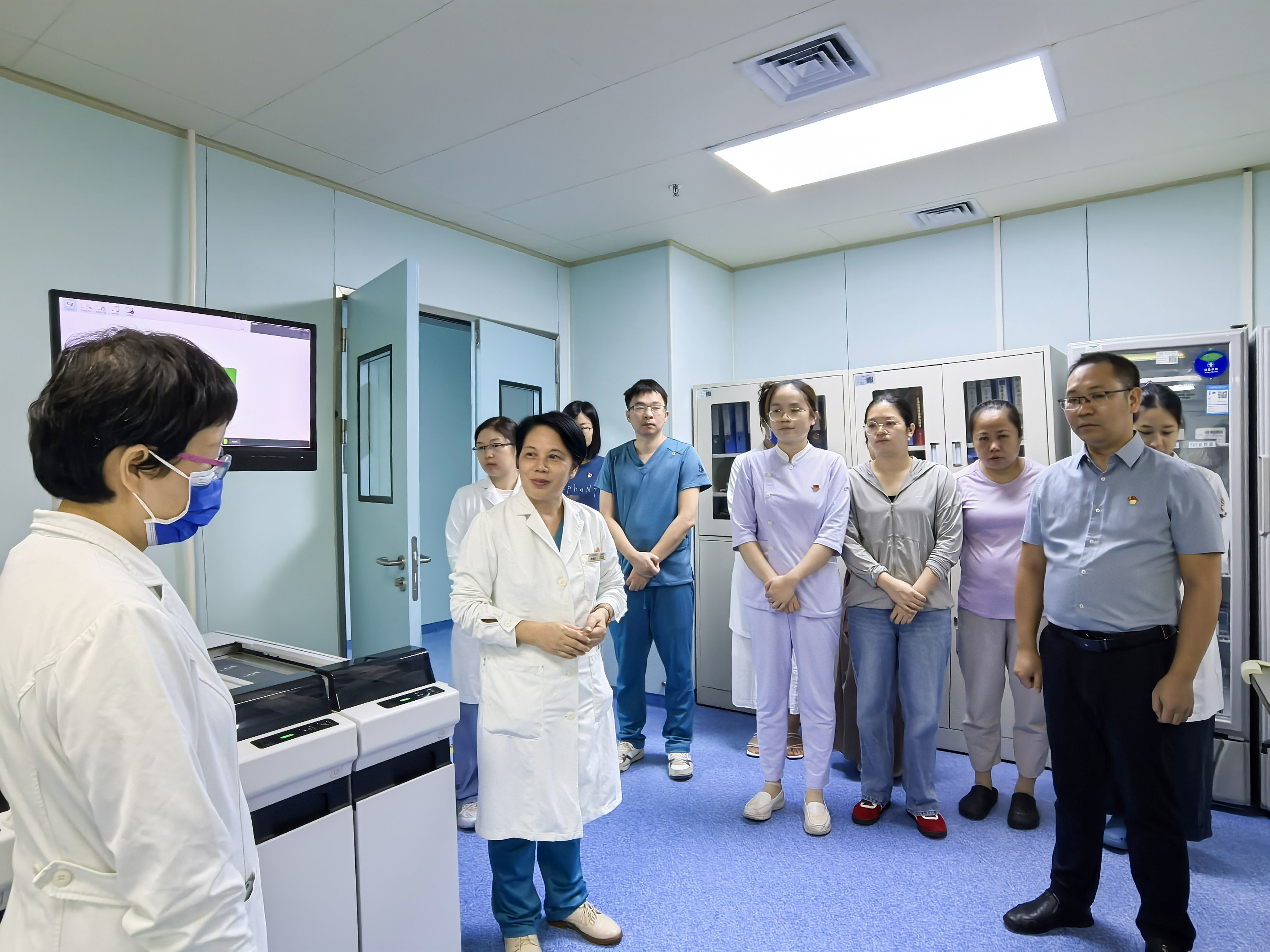 在医技第二党支部书记、检验科主任彭契六的带领下,大家首先实地参观检验科,详细了解检验项目的临床意义、检测流程和报告时效,增强对检验工作在临床决策中关键作用的认识。