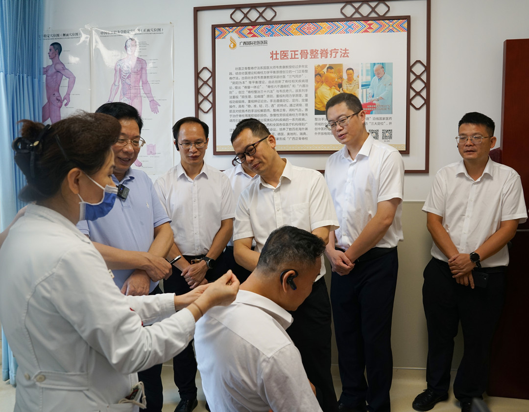 黄永伦一行先后到门诊大厅、院史馆、国医大师馆、治未病中心、药浴中心、中医(壮医)护理门诊、健康管理中心等处参观,详细了解医院建设发展、壮瑶药发展历程及医院体检中心发展情况,并通过观摩体验壮医水蛭疗法、壮医药物竹罐疗法、壮医药线点灸疗法,进一步了解壮瑶药在临床的广泛应用。