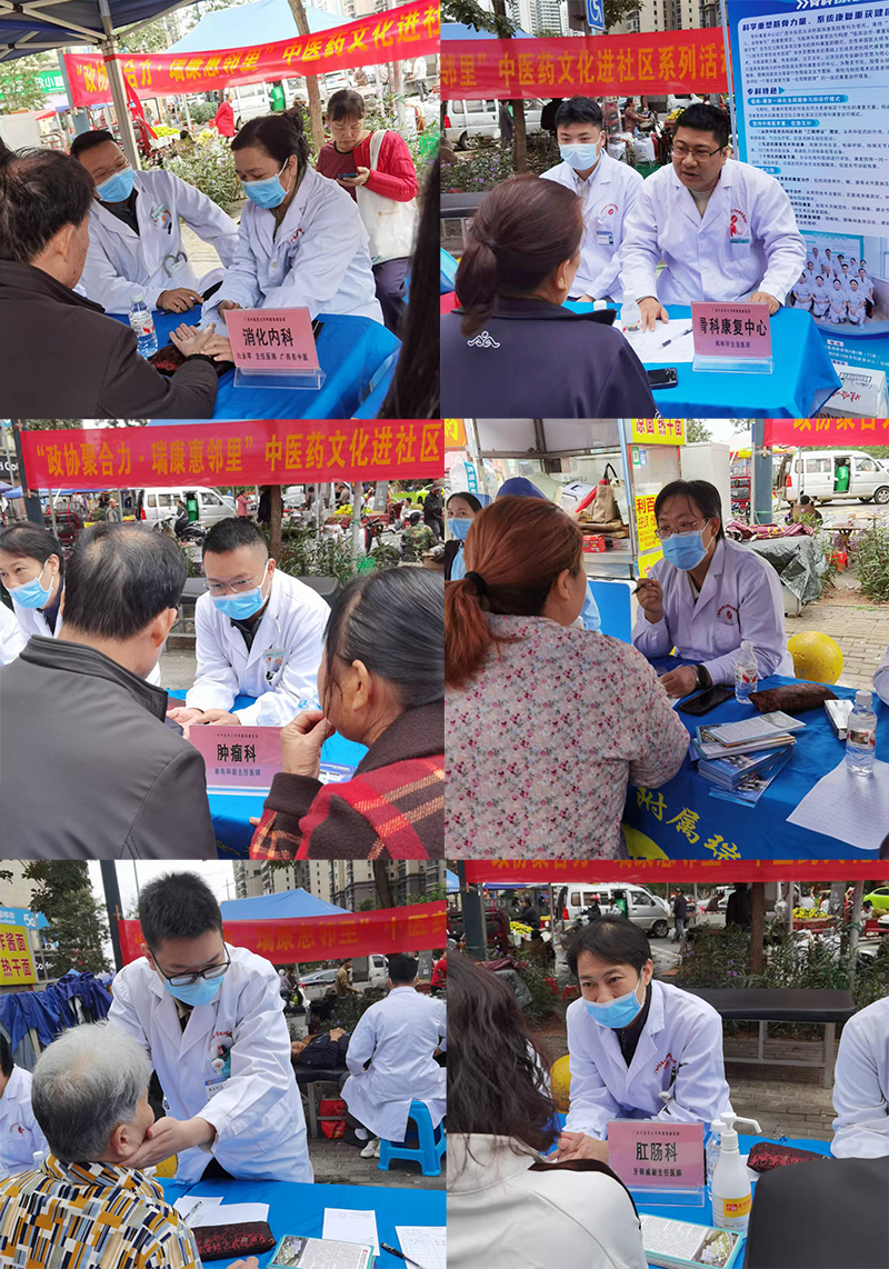 10月23日,附属瑞康医院医疗外联部组织消化内科、老年病科、肿瘤科一区、肛肠科、骨科康复中心、产科等多学科医护专家团队,走进南宁市良庆区金海社区开展“政协聚合力 · 瑞康惠邻里”中医药文化进社区系列活动,受到社区居民的欢迎。