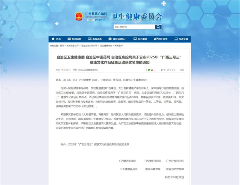 自治区卫生健康委、自治区中医药局、自治区疾控局于“广西三月三”期间,在全区组织开展了2025年“广西三月三”健康文化作品征集活动。活动启动后,第一附属医院积极响应,邀请区内科普专家开展专题培训,各科室结合群众需求与中医药特色打磨作品,最终,第一附属医院作品凭借鲜明的特色、优质的内容与良好的传播潜力,在视频类、图文类两大类别中均取得优异成绩,进一步扩大了第一附属医院健康科普工作的区域影响力。