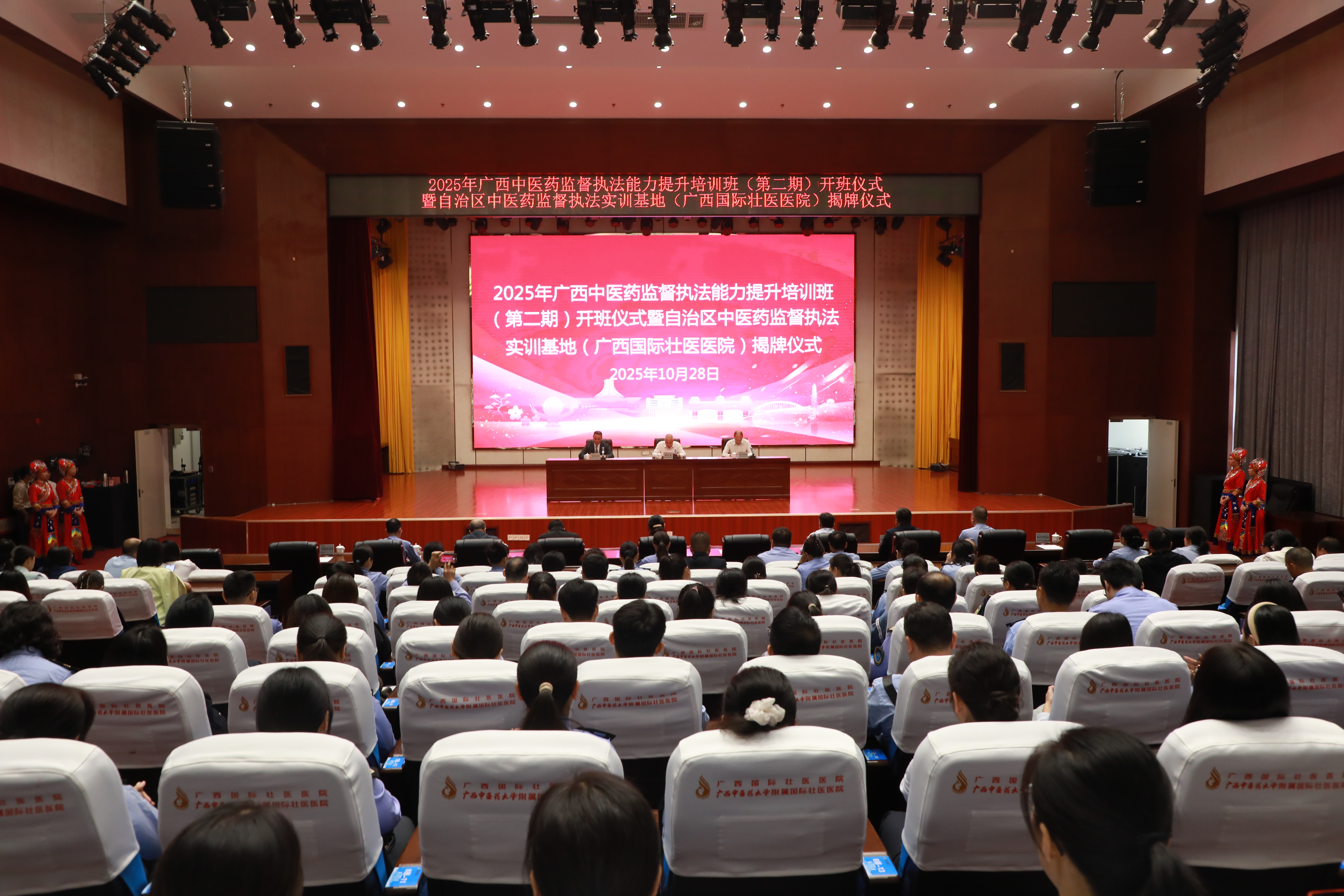 揭牌仪式后,2025年广西中医药监督执法能力提升班(第二期)开班。培训内容包括中医诊所监督、中药药事监督、中医技术监督、涉嫌非法行医监督等模拟执法实践,壮瑶医技法教学等内容。来自全区各地卫生监督机构、疾控中心共160余名学员参训。